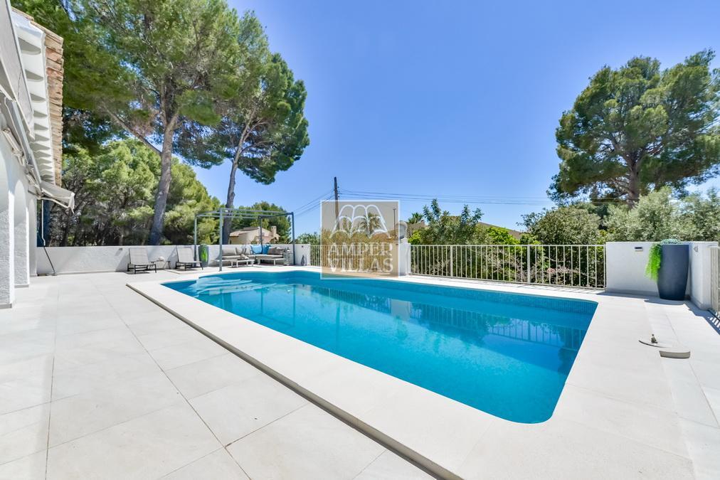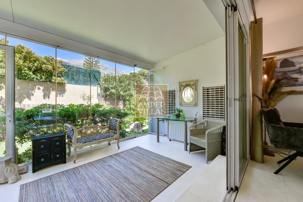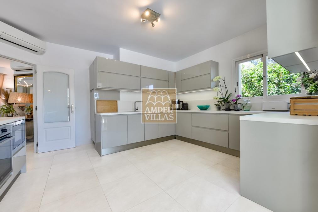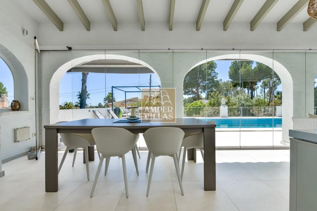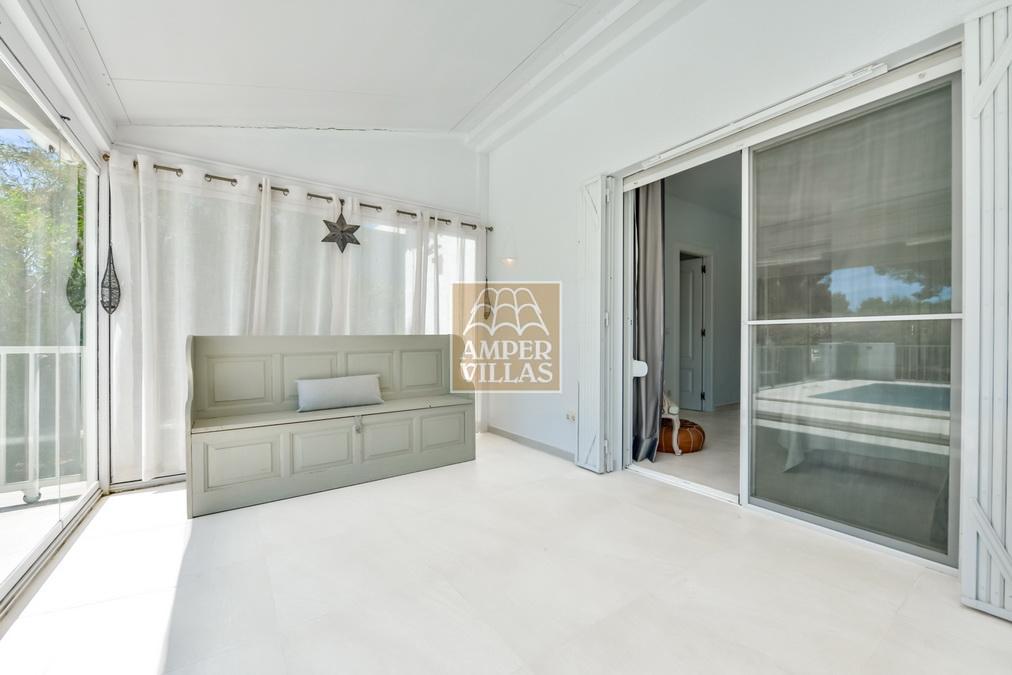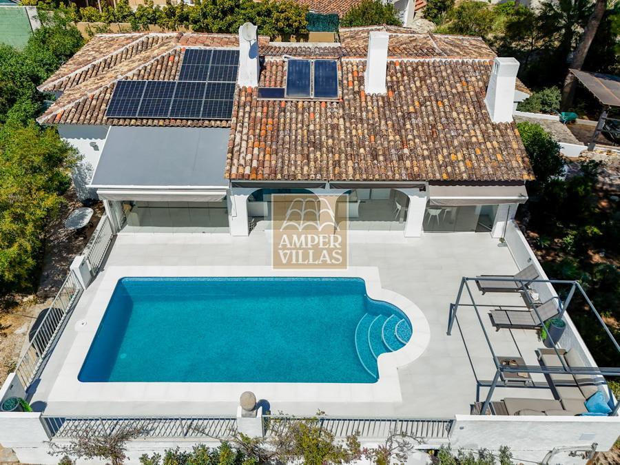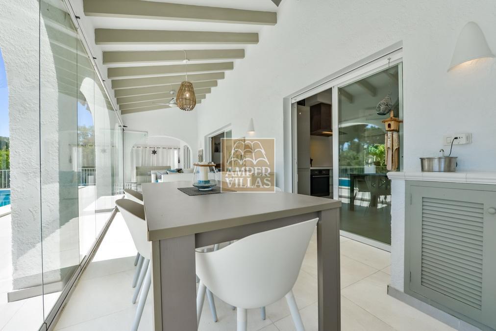 Fantástica villa, en un entorno verde y tranquilo, todo en una planta, gran salón-comedor con chimenea, preciosa cocina independiente, ambos con salida directa a la terraza, 4 dormitorios cada uno con baño en-suite, el principal también con salida directa a la terraza. Terraza acristalada en la parte de delante, con a continuación la piscina rodeada de terrazas abiertas. Otra terraza acristalada en la parte trasera de la casa. Aire acondicionado frio-calor, carport, orientación sur.