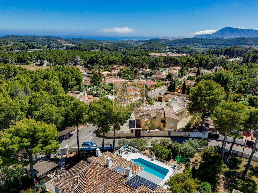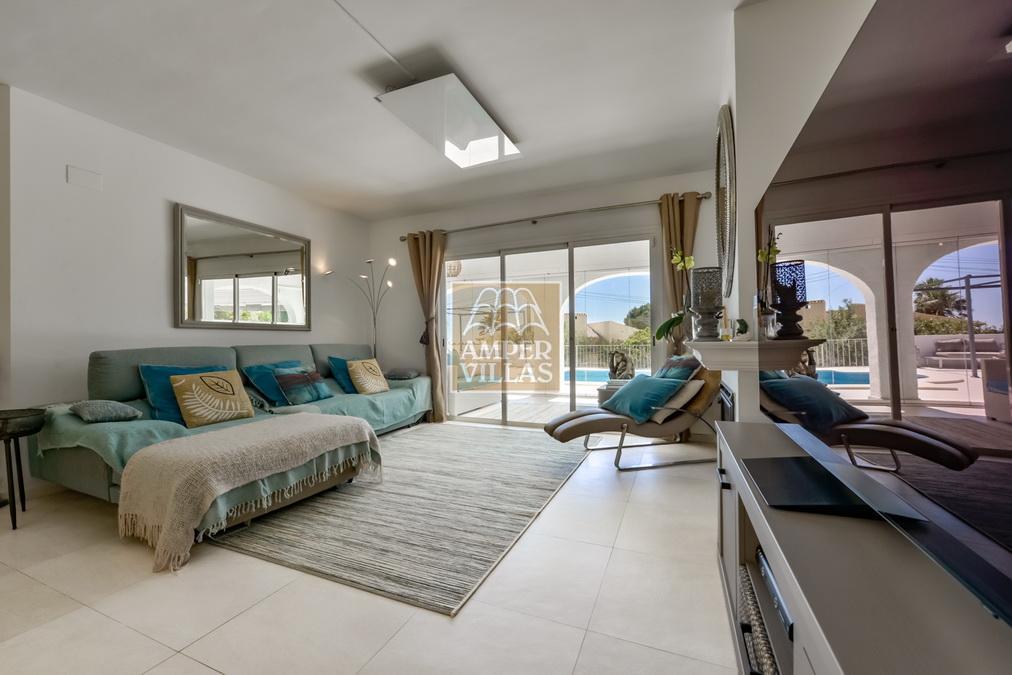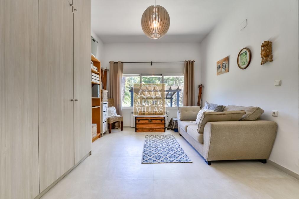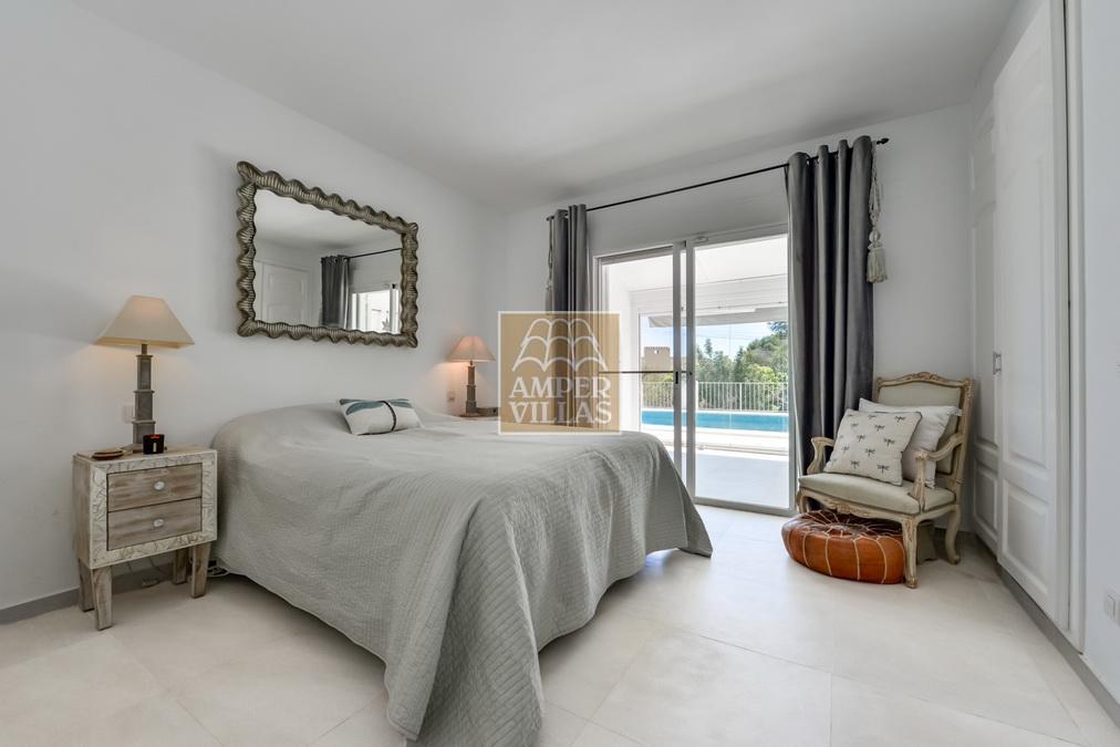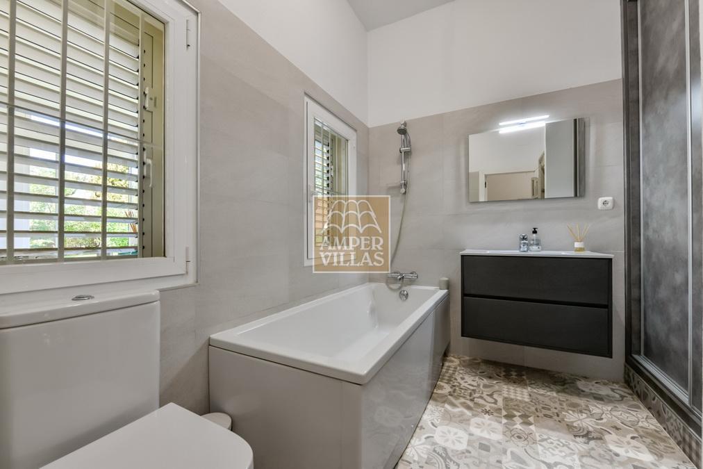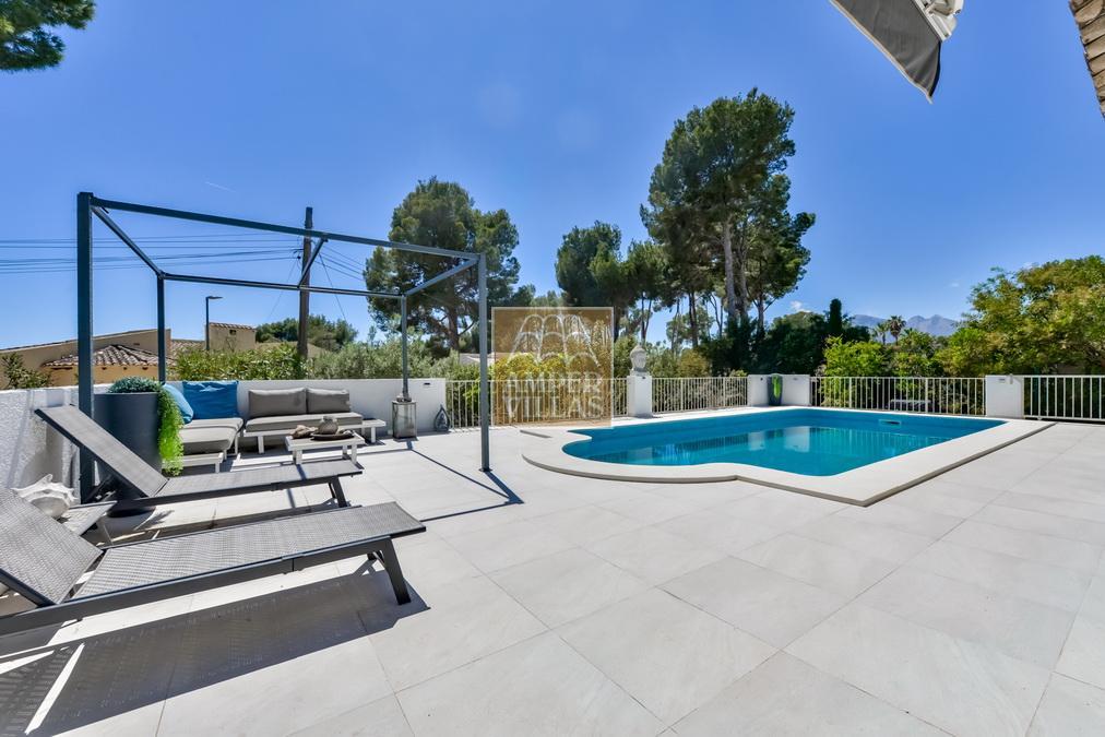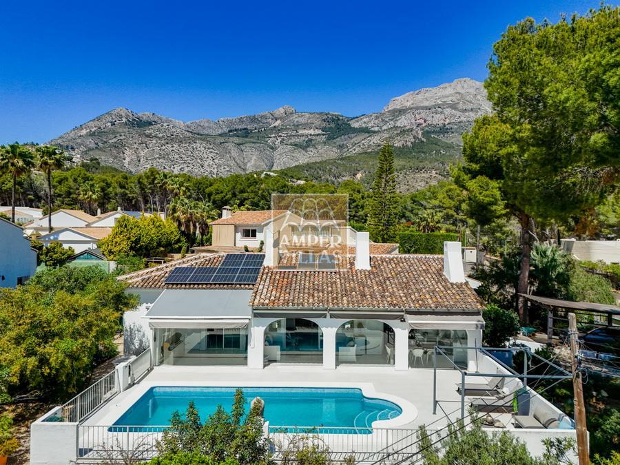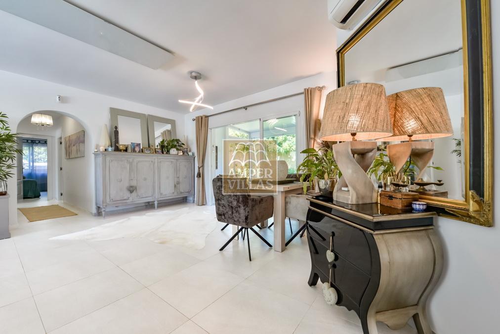 Fantástica villa, en un entorno verde y tranquilo, todo en una planta, gran salón-comedor con chimenea, preciosa cocina independiente, ambos con salida directa a la terraza, 4 dormitorios cada uno con baño en-suite, el principal también con salida directa a la terraza. Terraza acristalada en la parte de delante, con a continuación la piscina rodeada de terrazas abiertas. Otra terraza acristalada en la parte trasera de la casa. Aire acondicionado frio-calor, carport, orientación sur.