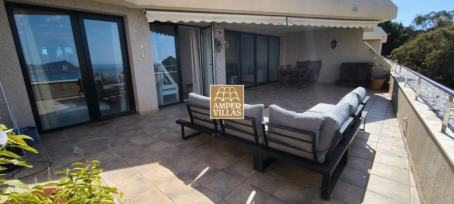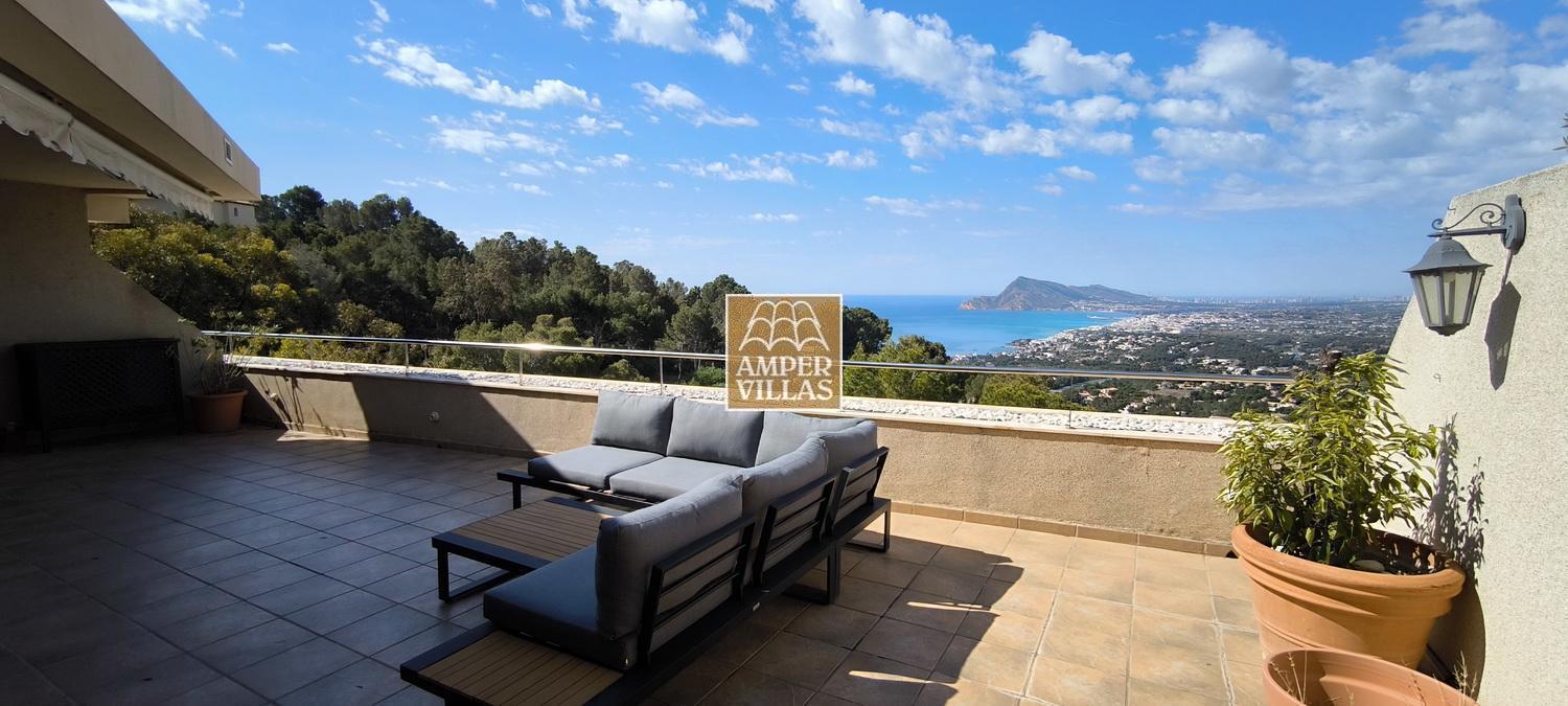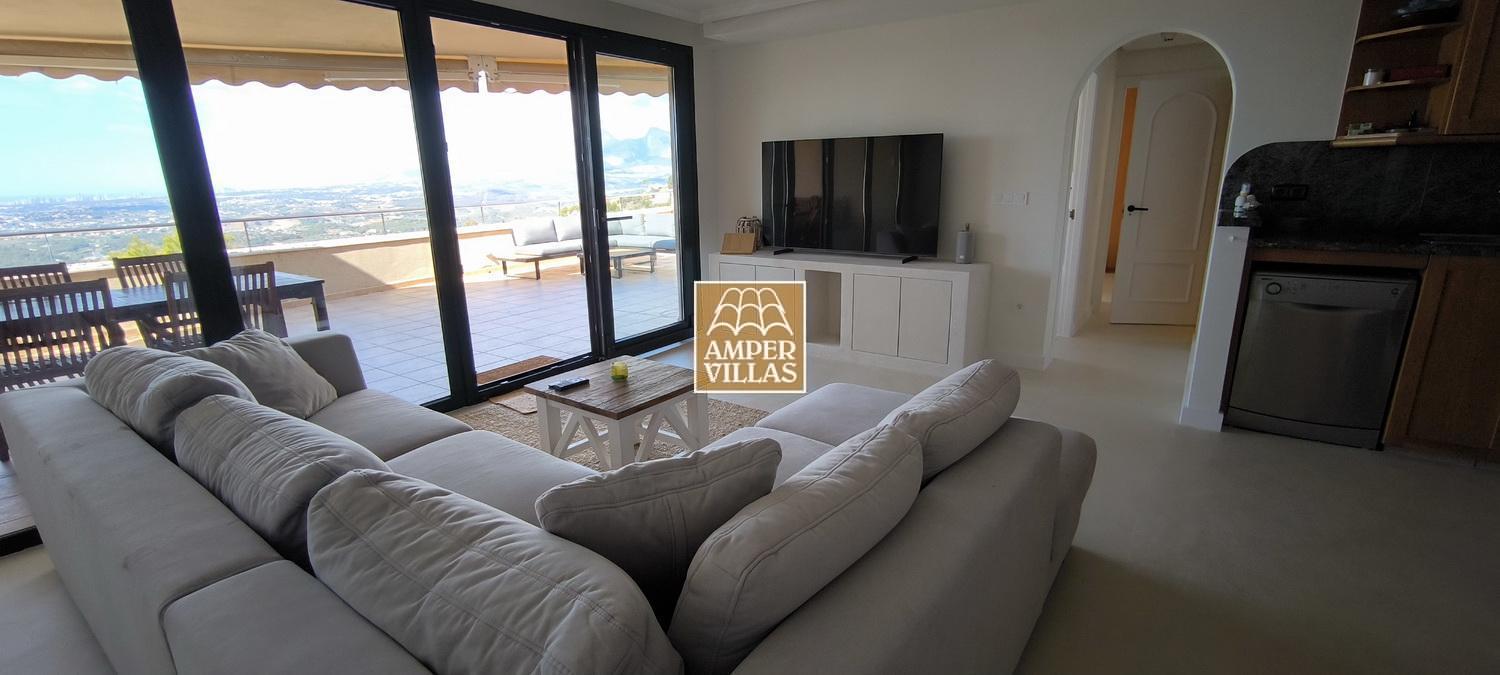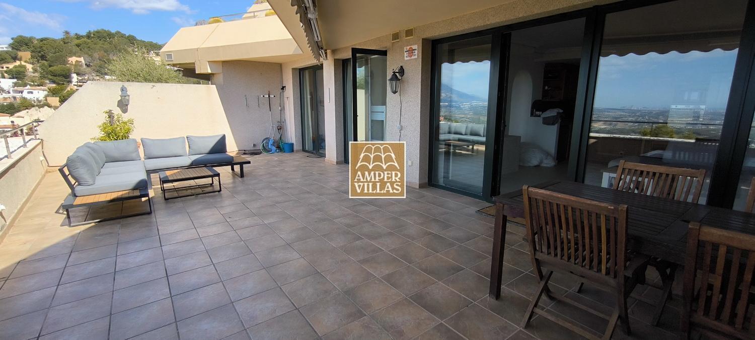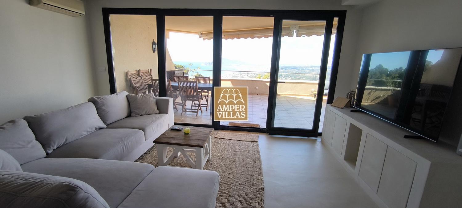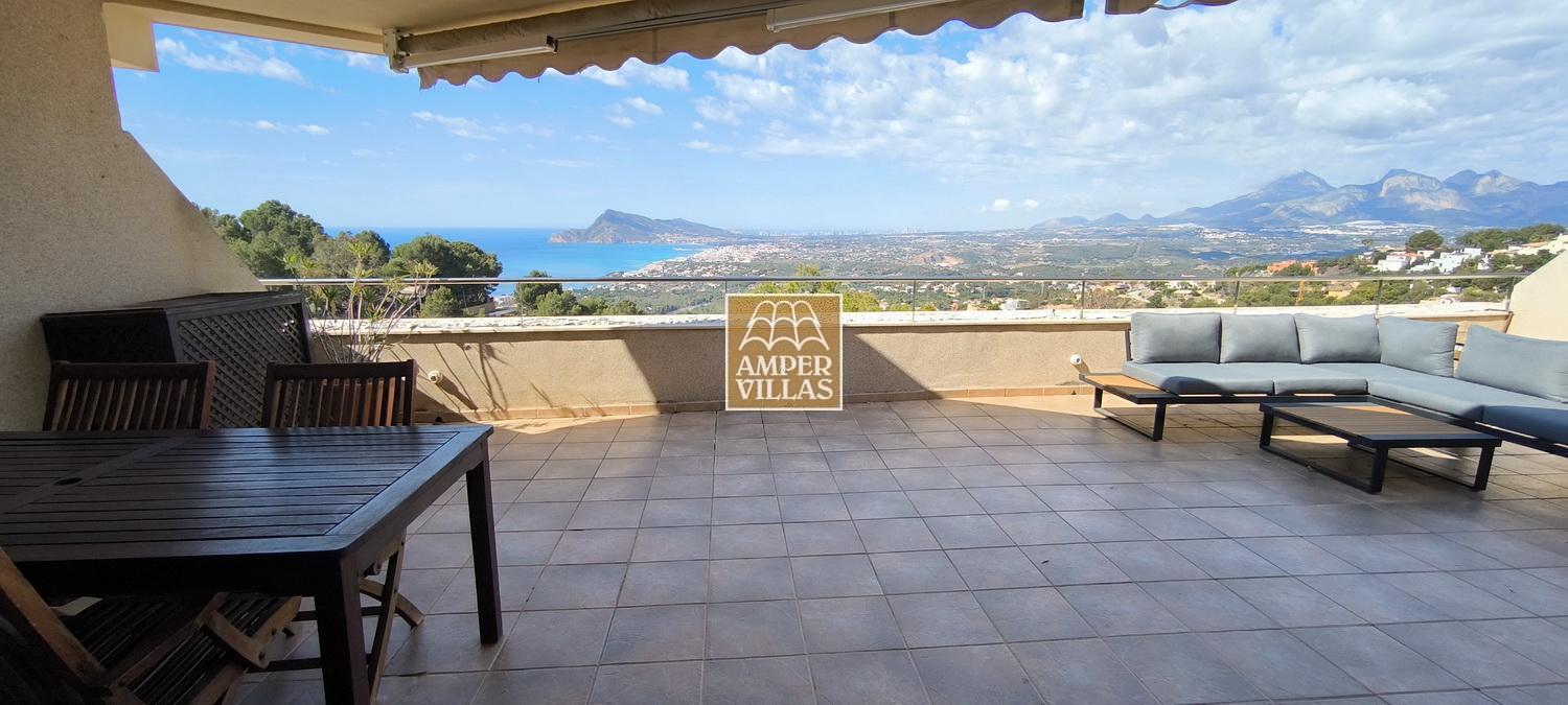 Formidable y soleado apartamento en complejo residencial de lujo, con 2 dormitorios, 2 baños, salón-comedor, amplia cocina americana, gran terraza con vistas panorámicas a la Bahía de Altea, Benidorm y las montañas, plaza de garaje, trastero, aire acondicionado frio/calor, 2 piscinas comunitarias.