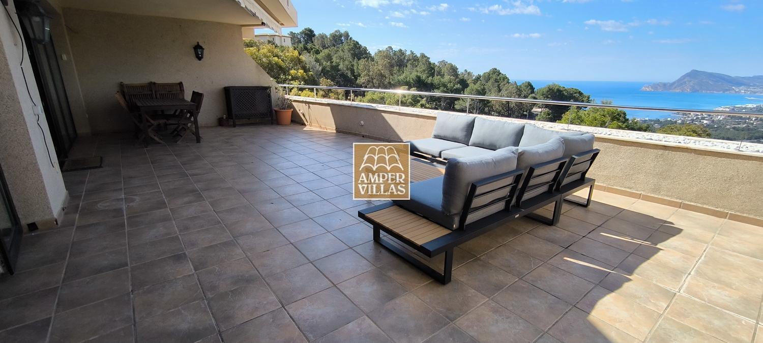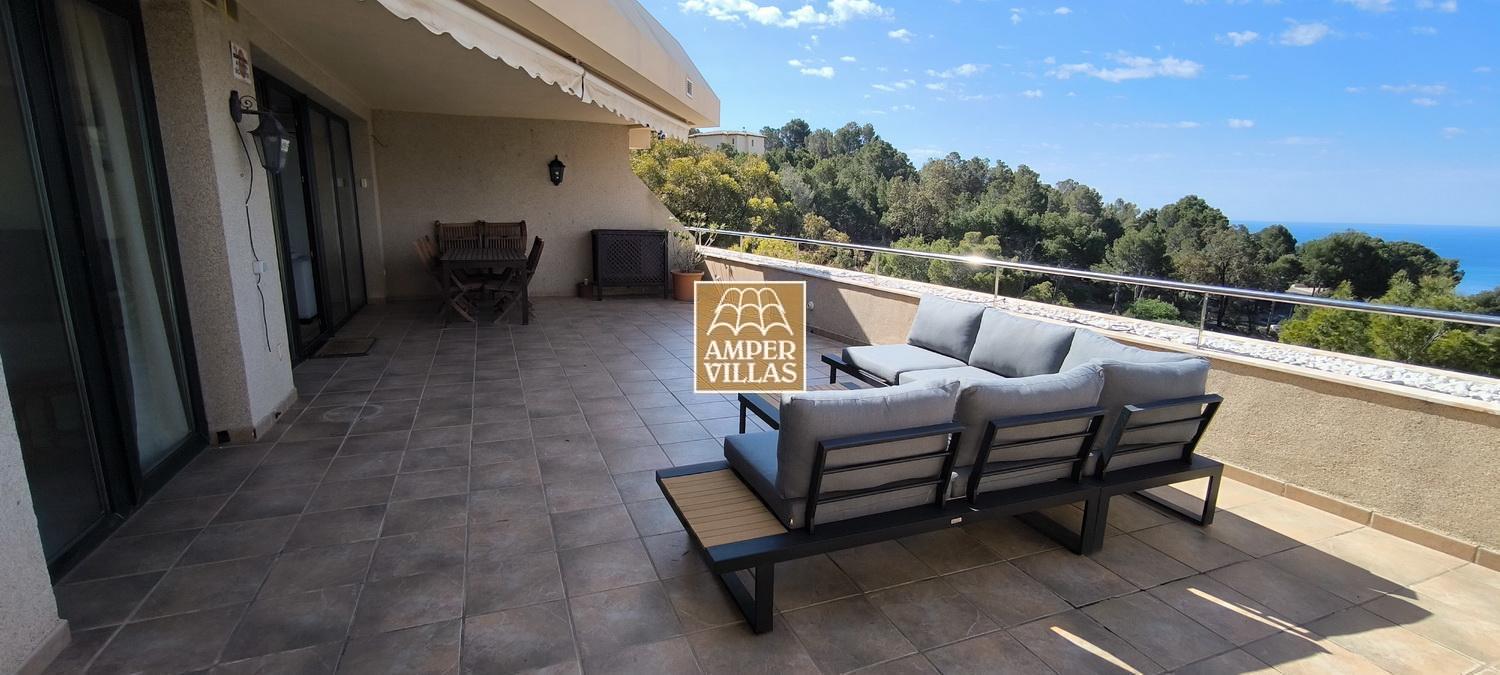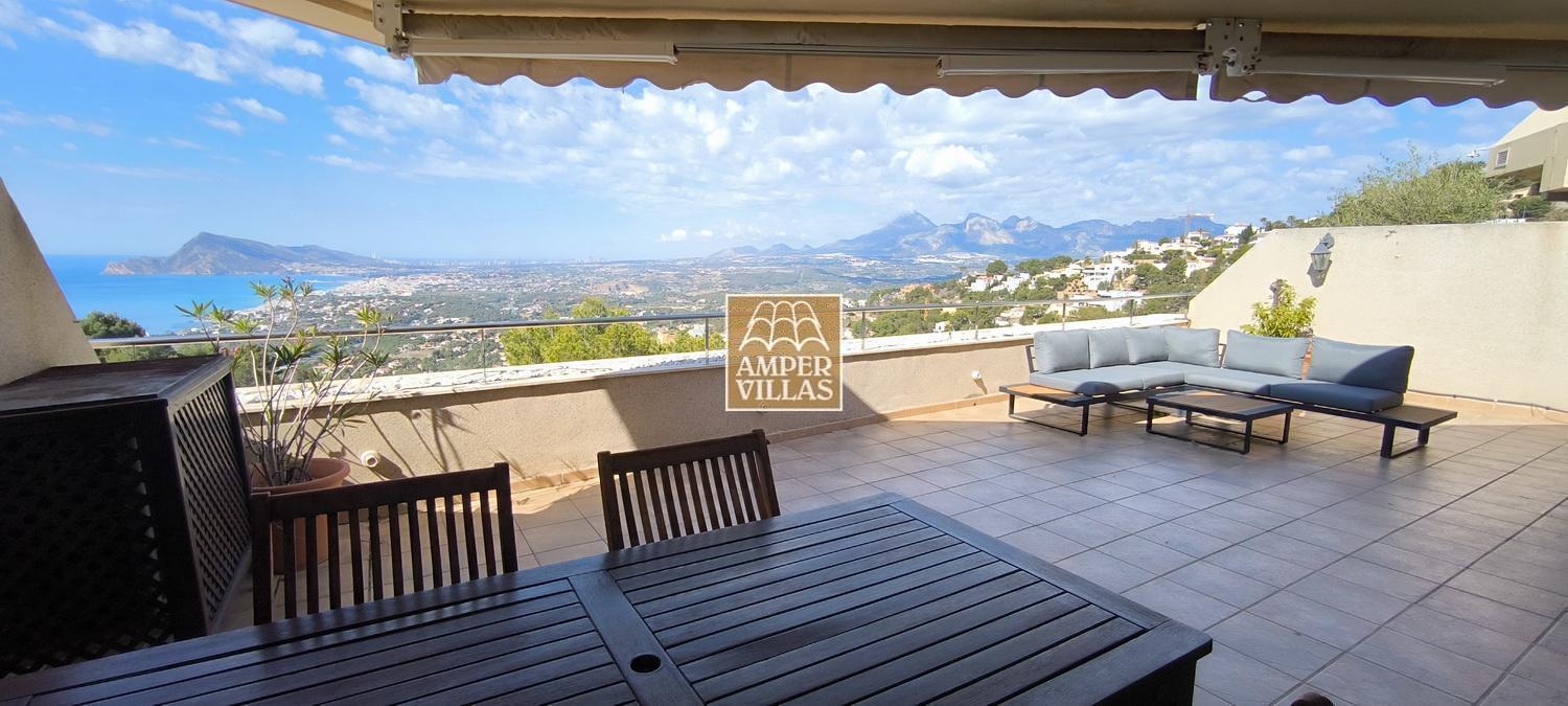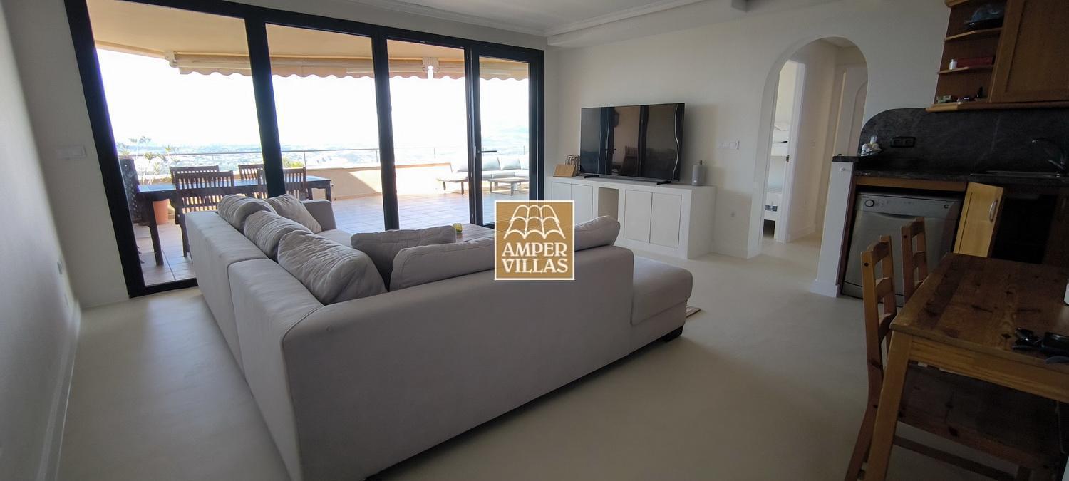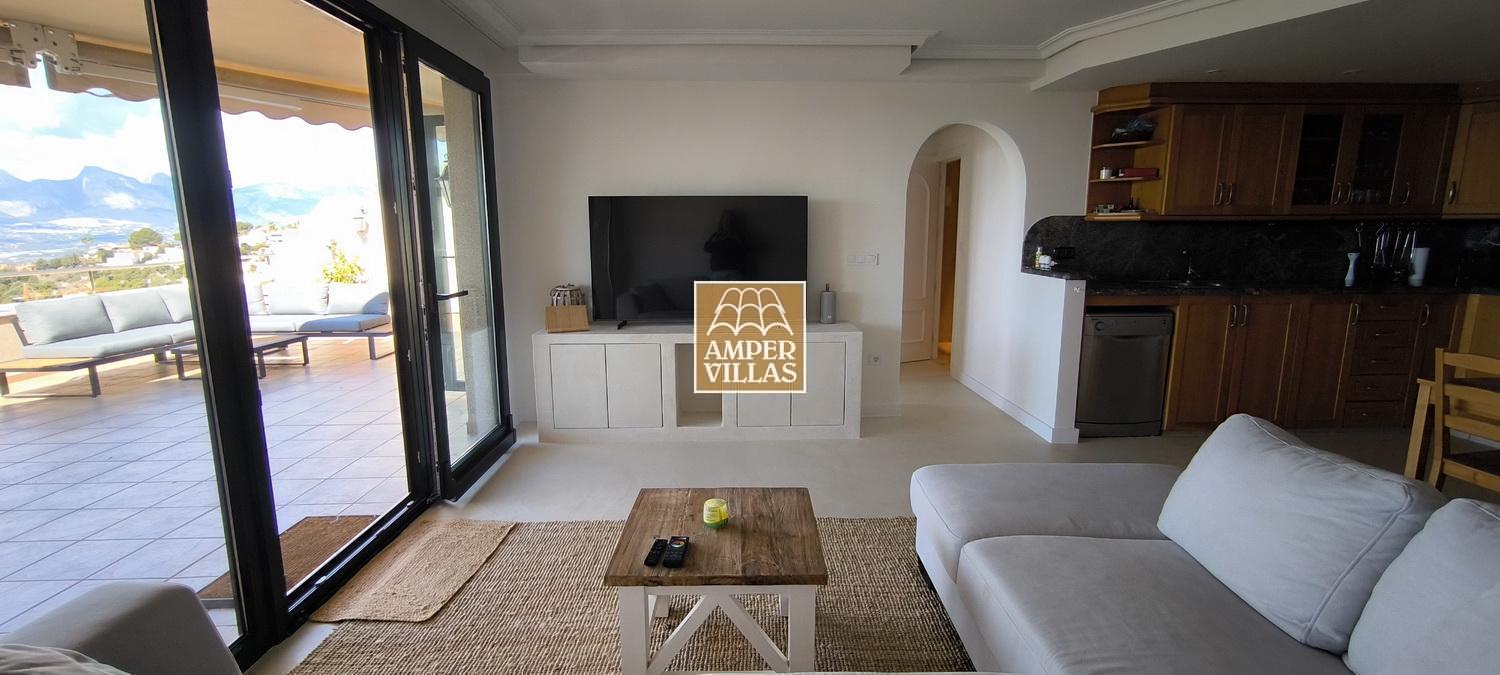 Formidable y soleado apartamento en complejo residencial de lujo, con 2 dormitorios, 2 baños, salón-comedor, amplia cocina americana, gran terraza con vistas panorámicas a la Bahía de Altea, Benidorm y las montañas, plaza de garaje, trastero, aire acondicionado frio/calor, 2 piscinas comunitarias.