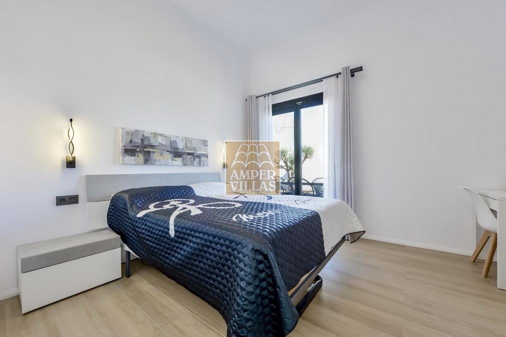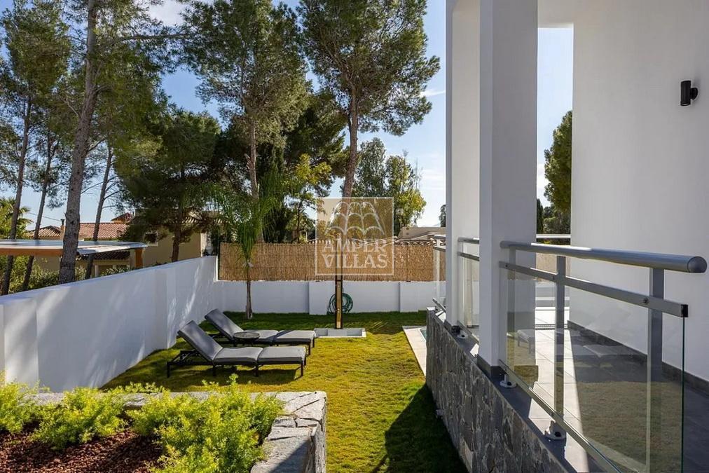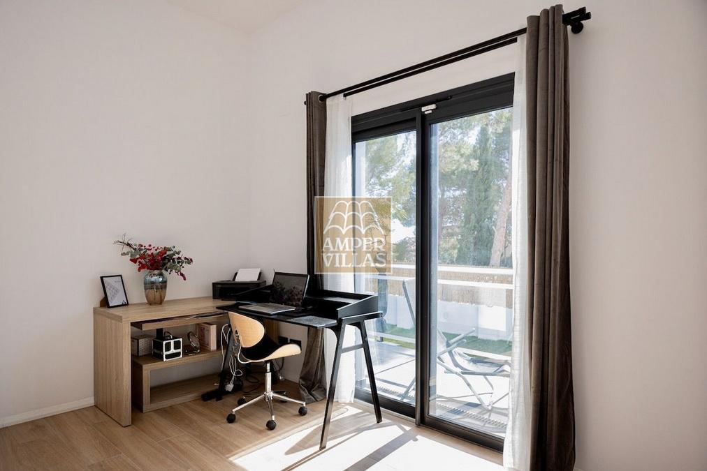 Villa moderna todo en una planta, con entrada, salón comedor, cocina independiente, en total 4 dormitorios, de los cuales uno con vestidor y baño en-suite, otra habitación con sauna integrada y ducha, y 2 más dormitorios, otro baño con ducha, aseo de invitados,techos muy altos de más de 3 metros, trastero/lavadero, terrazas todo alrededor de la casa, piscina de 3m x 9m con agua salada, paneles solares, aire acondicionado centralizado, precioso jardín mediterráneo y bonitas vistas a la Sierra Bernia.