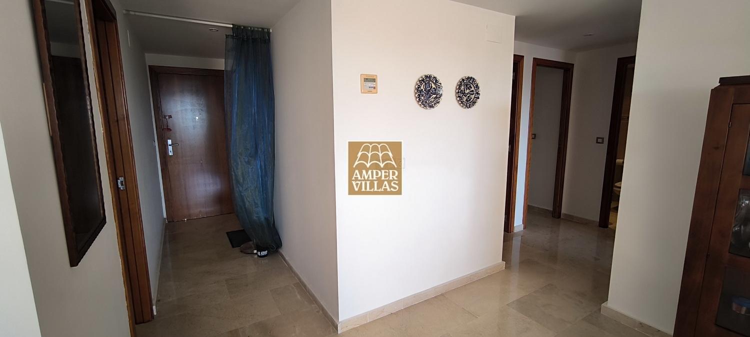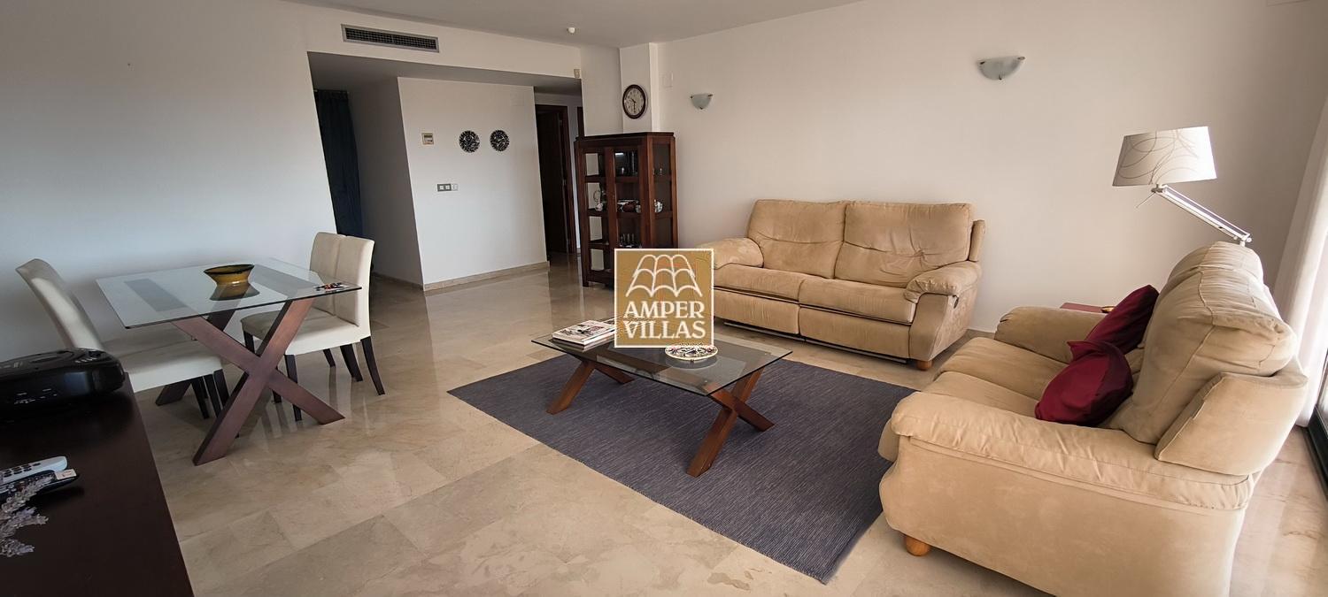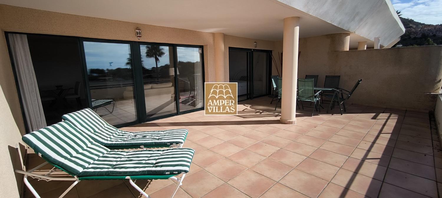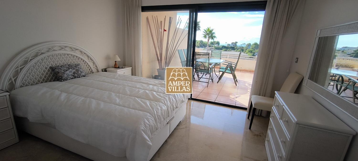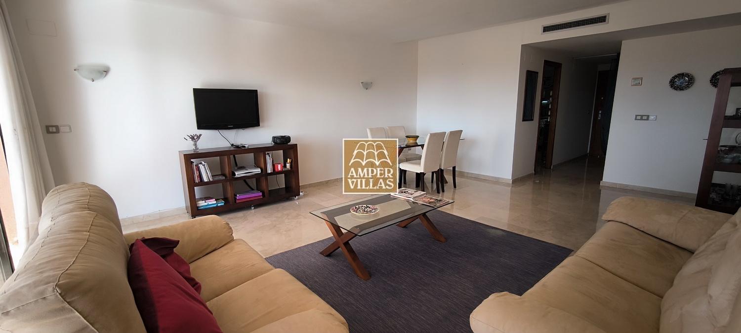 Amplio y acogedor apartamento con 3 dormitorios con armarios empotrados, 2 baños, gran salón-comedor, cocina equipada con lavadero, terraza de 40m² con vistas al mar, y las montañas, suelos de mármol, aire acondicionado frío/calor, garaje cerrado, residencial con 2 piscinas y bonitos jardines comunitarios.