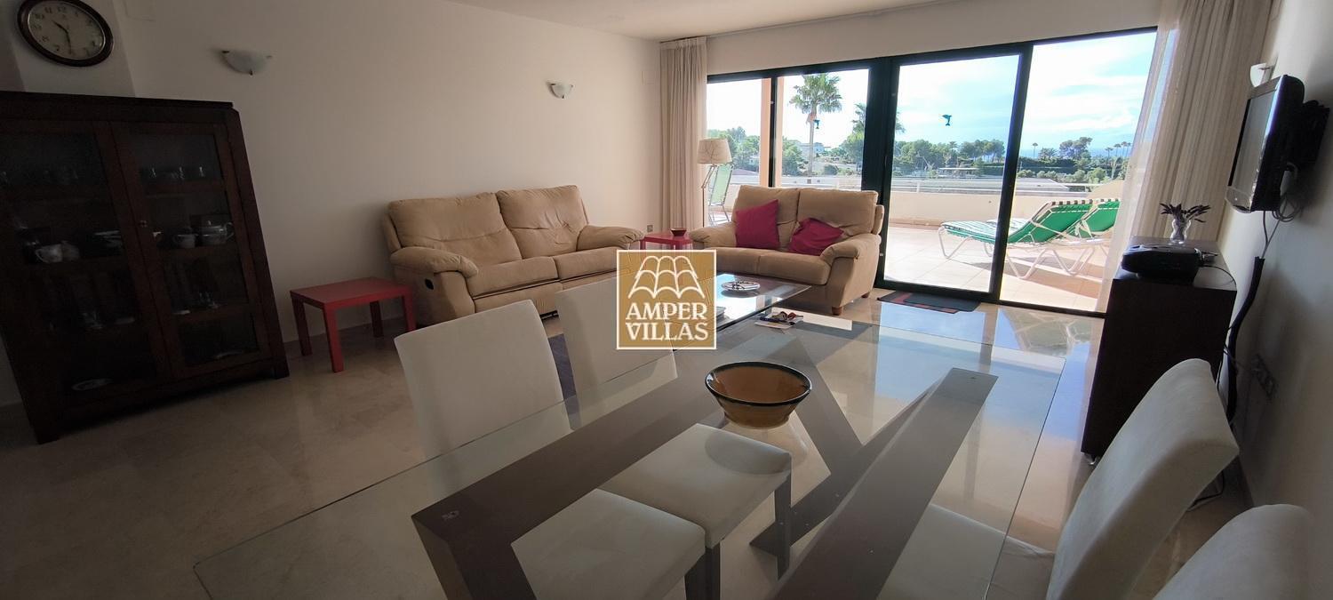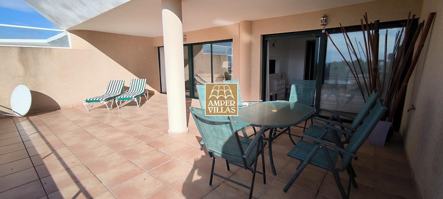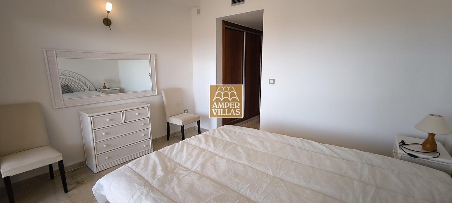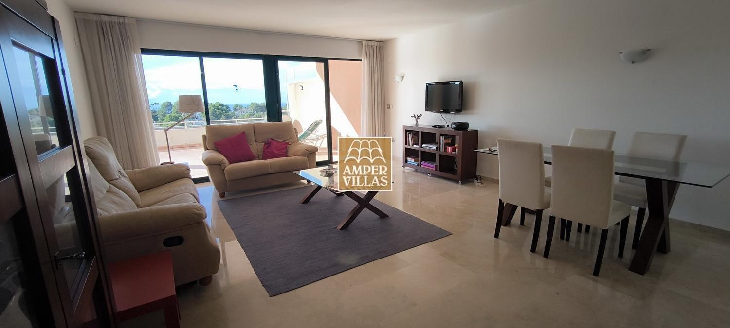 Amplio y acogedor apartamento con 3 dormitorios con armarios empotrados, 2 baños, gran salón-comedor, cocina equipada con lavadero, terraza de 40m² con vistas al mar, y las montañas, suelos de mármol, aire acondicionado frío/calor, garaje cerrado, residencial con 2 piscinas y bonitos jardines comunitarios.