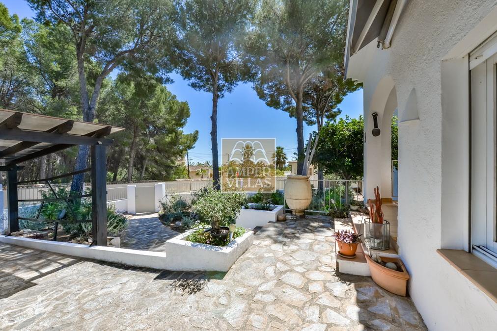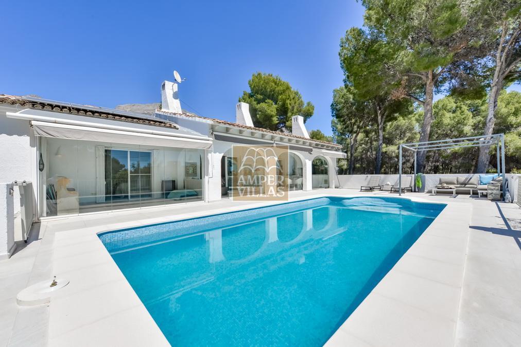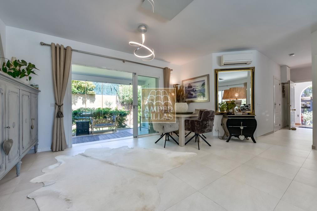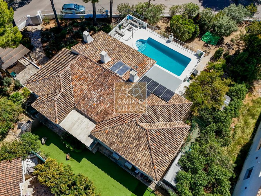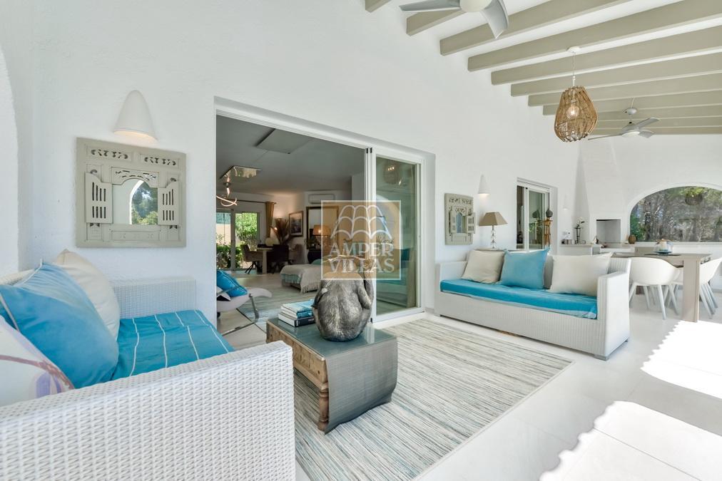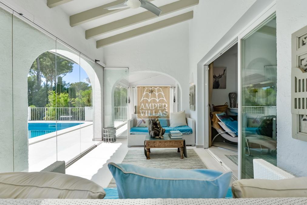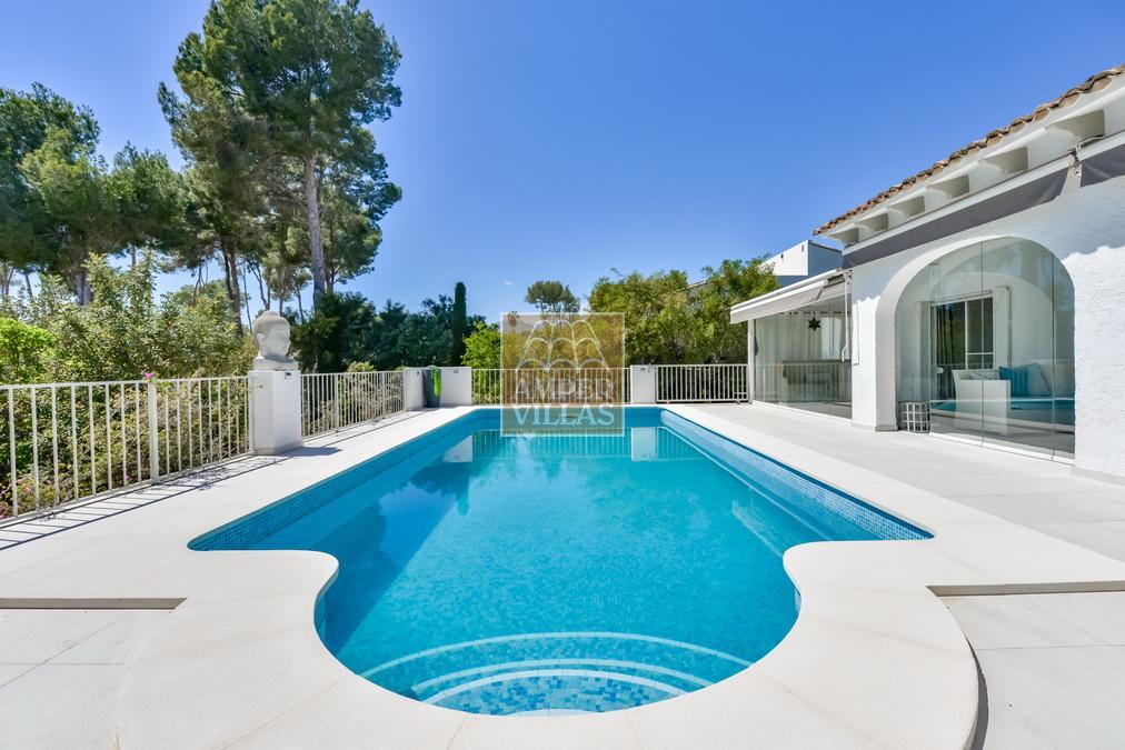 Fantástica villa, en un entorno verde y tranquilo, todo en una planta, gran salón-comedor con chimenea, preciosa cocina independiente, ambos con salida directa a la terraza, 4 dormitorios cada uno con baño en-suite, el principal también con salida directa a la terraza. Terraza acristalada en la parte de delante, con a continuación la piscina rodeada de terrazas abiertas. Otra terraza acristalada en la parte trasera de la casa. Aire acondicionado frio-calor, carport, orientación sur.