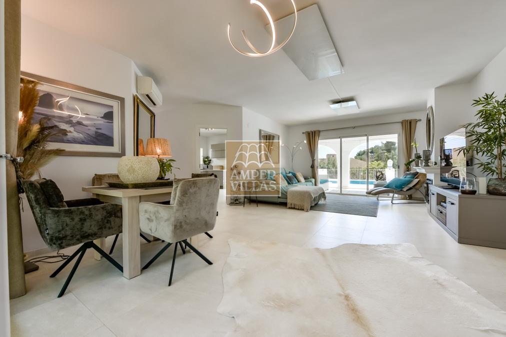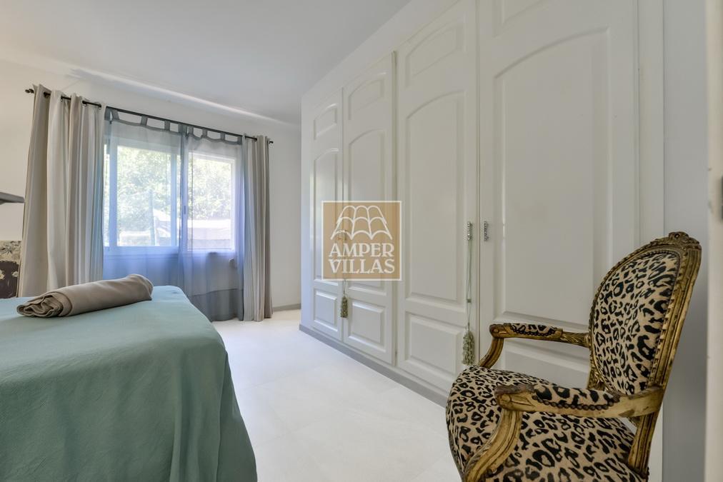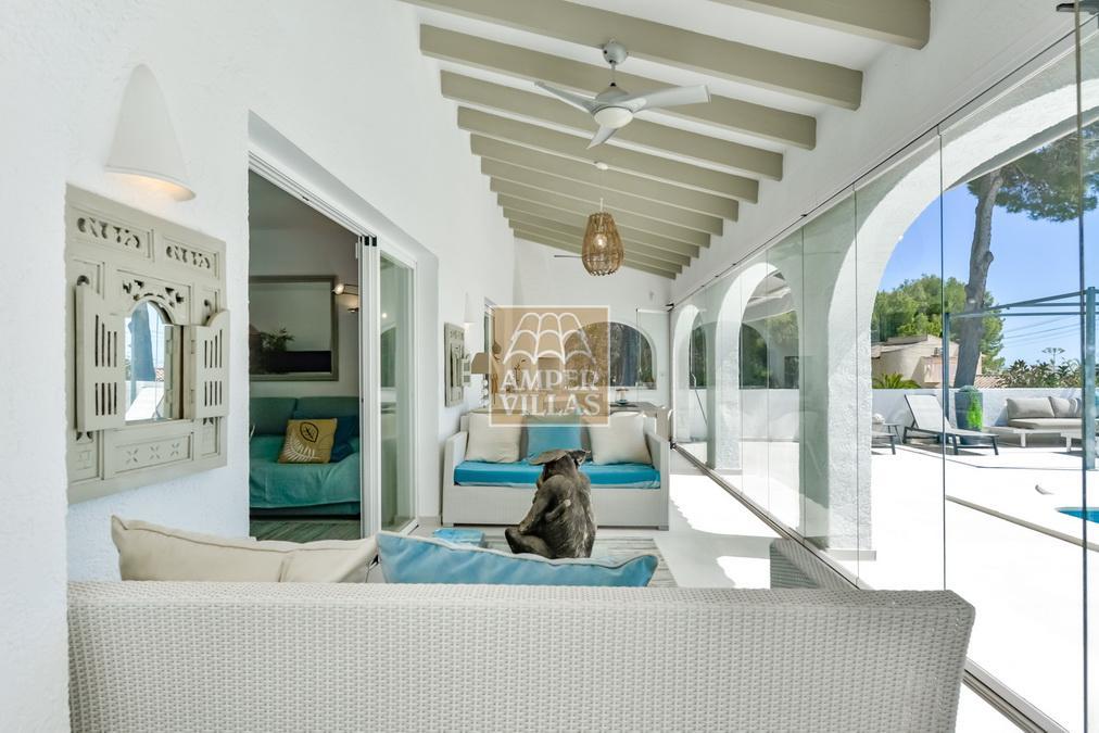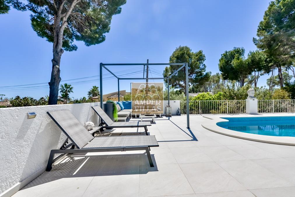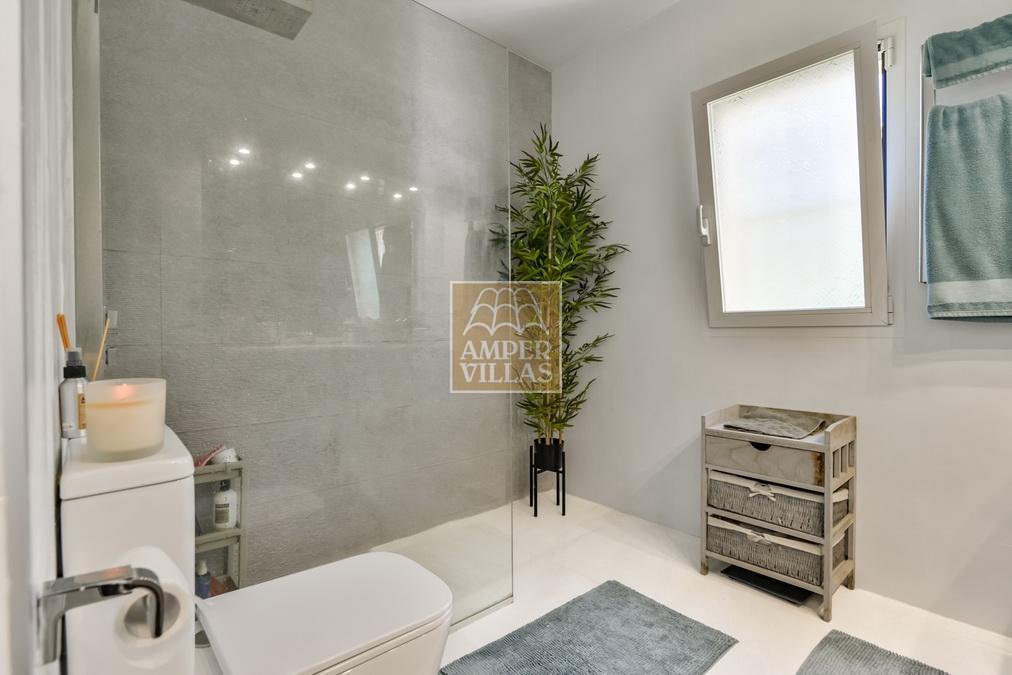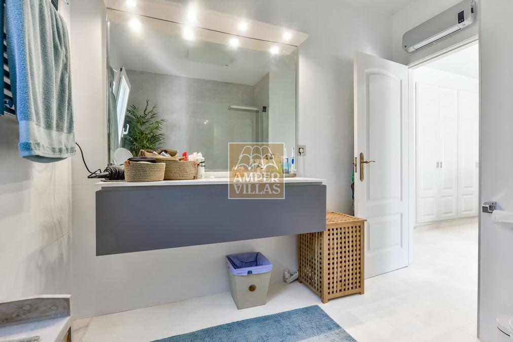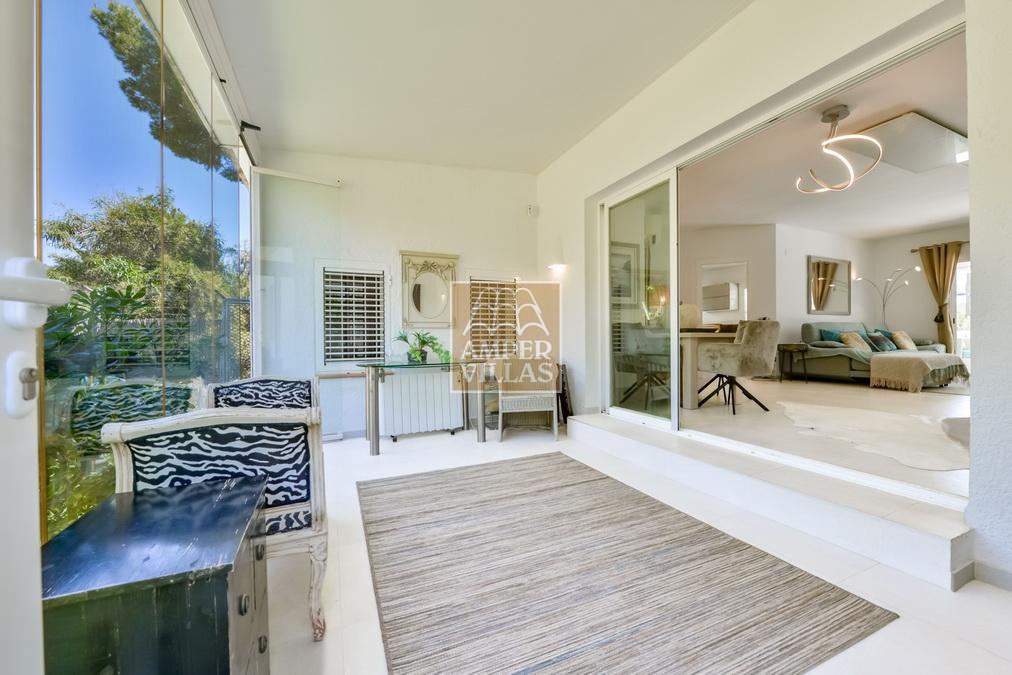 Fantástica villa, en un entorno verde y tranquilo, todo en una planta, gran salón-comedor con chimenea, preciosa cocina independiente, ambos con salida directa a la terraza, 4 dormitorios cada uno con baño en-suite, el principal también con salida directa a la terraza. Terraza acristalada en la parte de delante, con a continuación la piscina rodeada de terrazas abiertas. Otra terraza acristalada en la parte trasera de la casa. Aire acondicionado frio-calor, carport, orientación sur.